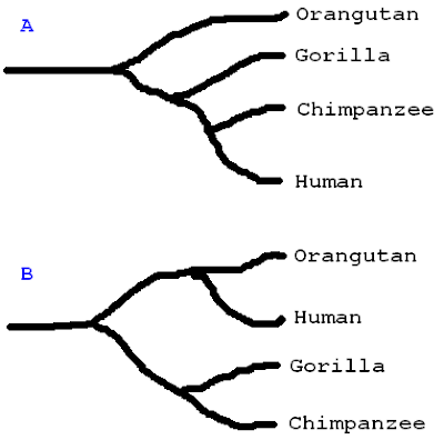 The phylogenetic tree of the relationship of these four apes would then look like figure B, rather than the usual one in figure A:
